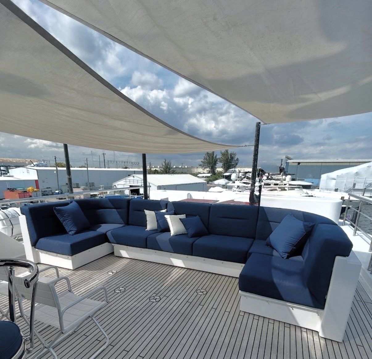 Sunbrella® is a premium woven acrylic fabric known for its exceptional breathability, UV resistance, and fade-resistant color. It’s ideal for yacht covers and customers looking for a durable, soft, and aesthetically pleasing cover that holds up beautifully in sun-drenched environments. Plus, it's resistant to mold, mildew, and stains, and it’s easy to clean — perfect for long-term dockside use or storage.